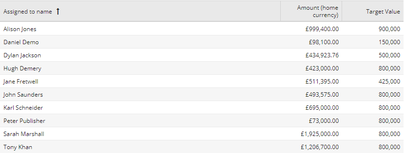 This will display the Totals of the Target and the Total Percentage of the Target that has been achieved as well as each individual’s performance against the Target.