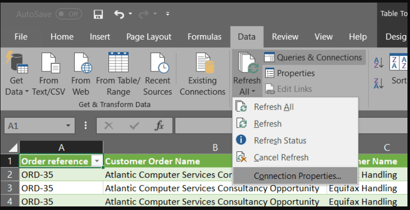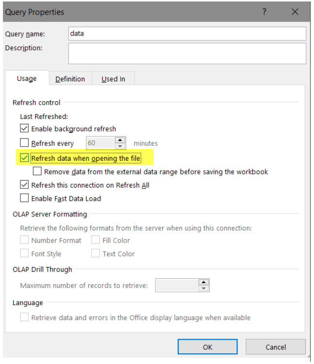 It is possible to have this report automatically refresh whenever you open the file. To do this, go to Data > Refresh All > Connection Properties > Refresh data when opening file