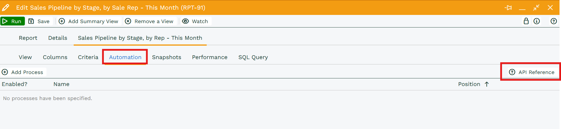 To create the URL you will first need to edit the Report you want to send to Excel. Then select the specific view such as Details or Summary, on this view select the Automation tab and press the API Reference button.