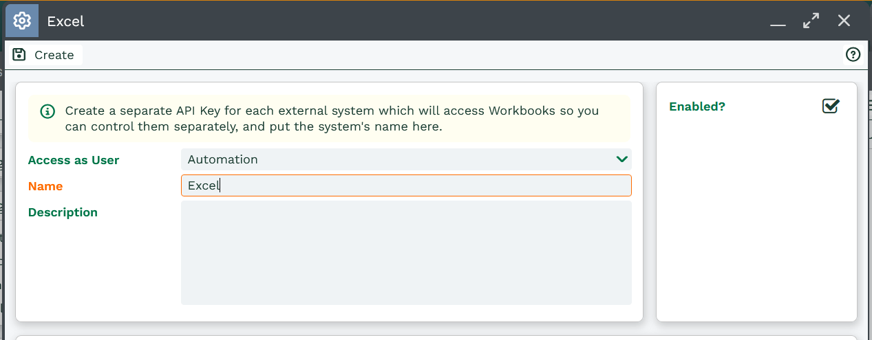 Name: Give the API Key an appropriate name such as Excel so you can easily identify the purpose of the API Key in the future.