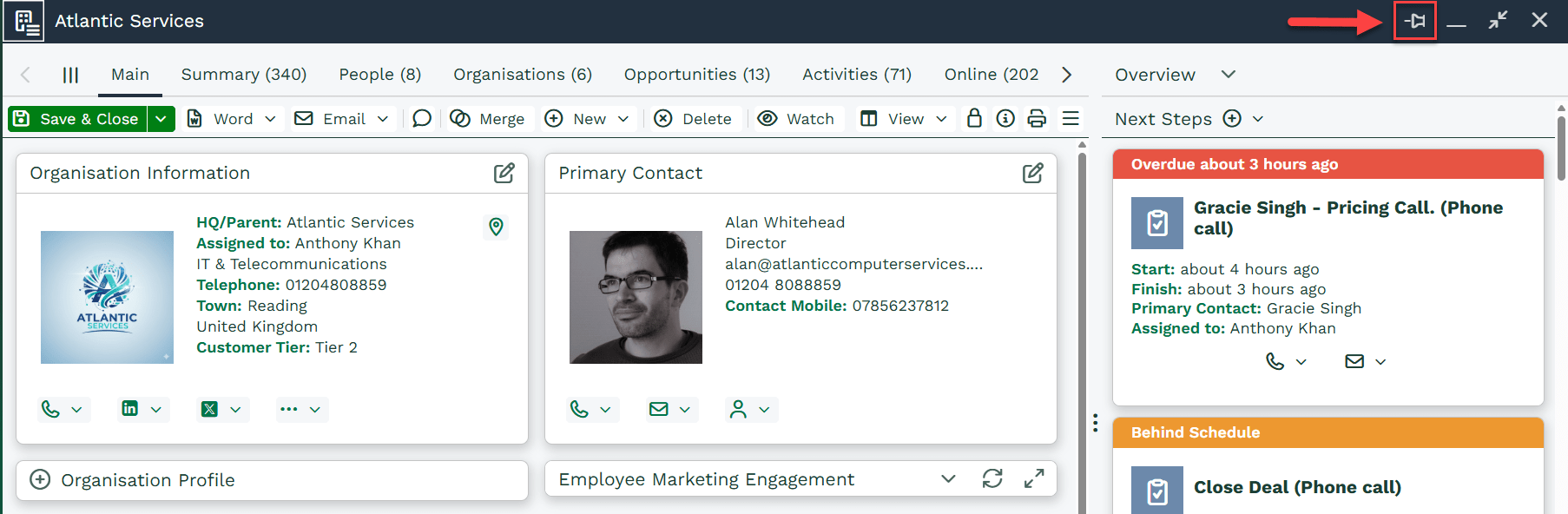 You may find that you would like certain records, reports, or perhaps Landing Pages to open automatically when you login. You can do this by ‘pinning’ these items with the pushpin icon in the top right – clicking this symbol ‘pins’ it to your desktop, causing it to open automatically when you login. You can ‘unpin’ an item by clicking this pushpin again, or by deleting it from the My Pinned Windows section of your Preferences.