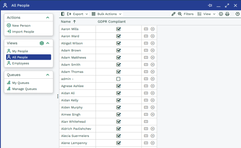 NOTE: Please note that the Compliance record has been created in order to help you store your compliance under GDPR; Workbooks is not able to advise you specifically on how you control your data to be GDPR Compliant.