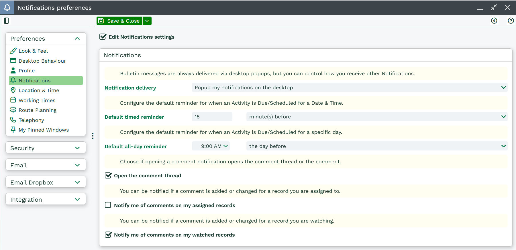 Notifications for Comments can be configured within this screen. You have the option to choose if Opening a comment notification will open the comment thread, choose whether to be notified of comments on your assigned records or watched records.