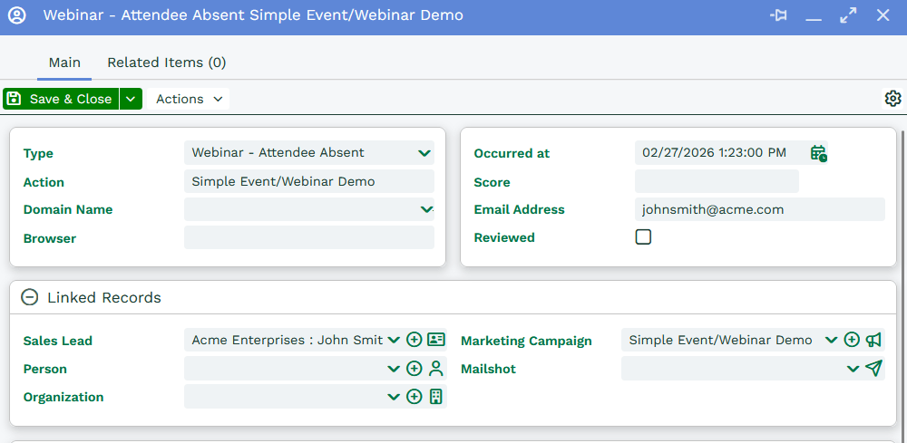 In addition to the above, a Workbooks Event can be configured to automatically send out Attended or Absent emails for each Event Attendee record to follow up after a Webinar. See here for further information.