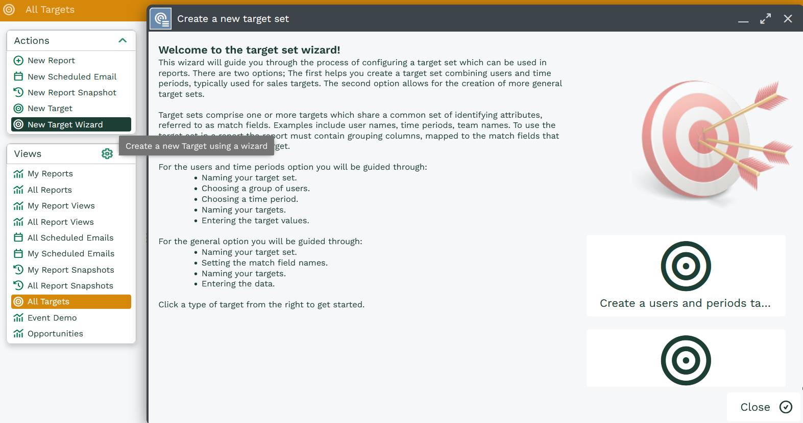 Target Sets can be created by going to Start > Reporting > All Targets, and either creating them manually or via the Target Wizard. The Wizard will walk you through each step in detail; this is recommended for the first time Targets are created.