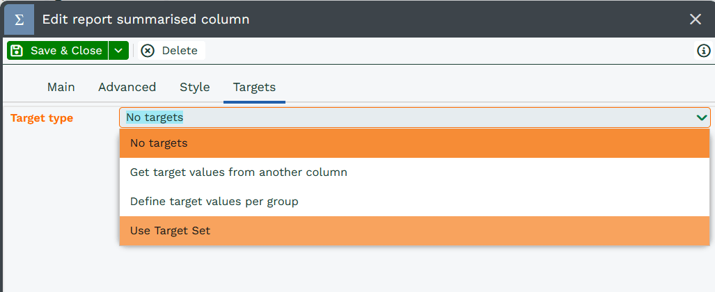 If you have already set up Targets within a Report without using a Target Set, you can convert those into a Target Set, making them more reusable and easier to amend in future. To do this, navigate to the Report Summary tab and open the column that has the targets already applied, and on the Target tab click ‘Convert to Target set‘. This will open the new Target Set, and on the Target Values tab you will see all of the existing values have been populated automatically.