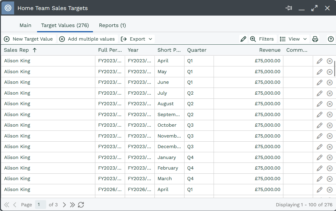 Target Sets are independent records where you can assign general or time period specific targets for Users which can then be applied to any report using the Targets tab on summarised columns. The key difference between general and time period targets is that the latter are based on Calendar or Accounting Periods while general targets are not. For example, you could set a revenue target of £10,000 per quarter to one of your sales team, but a general target number of closed Cases for your support staff.