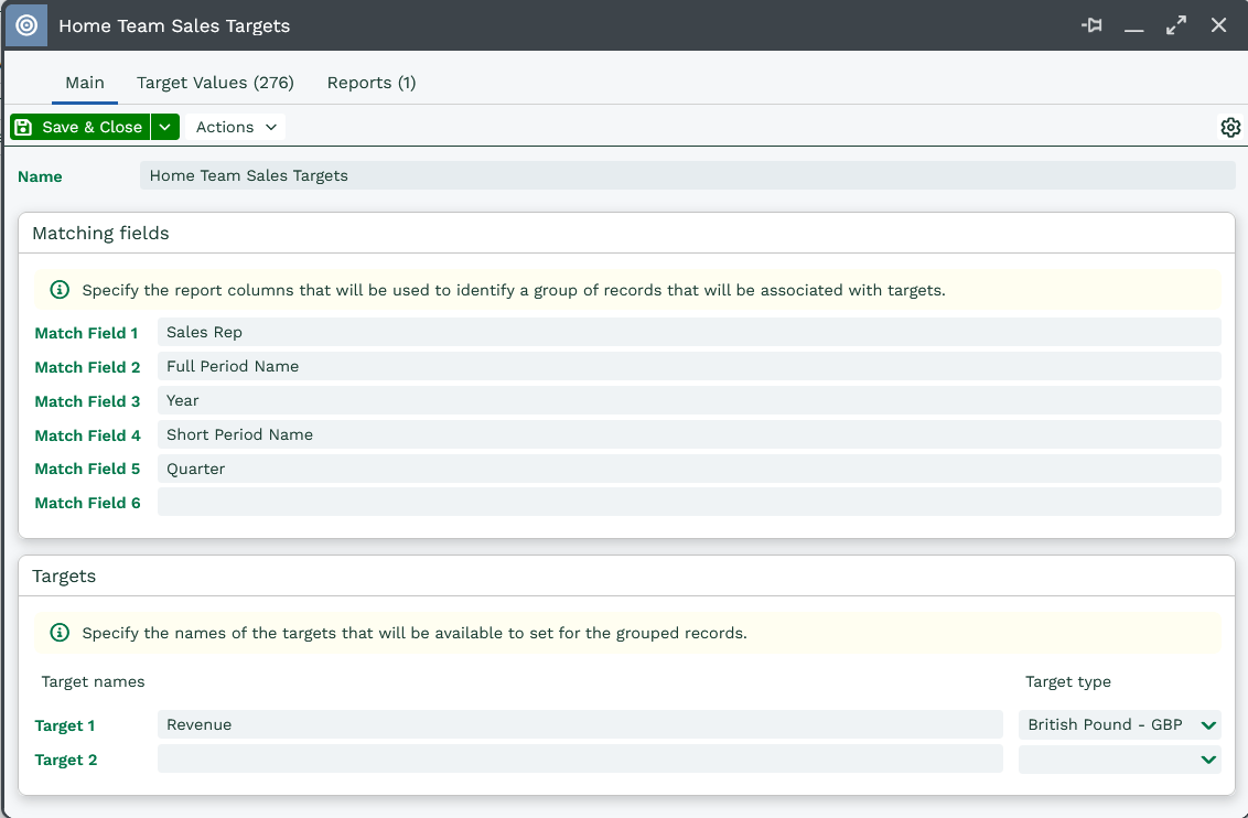Once you have created a Target Set, you will be presented with your final Target record as shown below. Think of the Match Fields as a list of potential columns in a report that you could use to match against your Targets. You will need to ensure that you have at least one column in your report that can be used to match against one of these fields (e.g. Sales Executive could be matched against the Assigned To column).