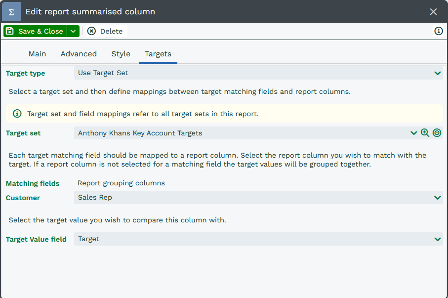 Once a Target Set has been created, you can apply it to a report by going onto the desired summary view, clicking on a summarised column and navigating to the Targets tab. Here you select ‘Use Target Set’ from the Target Type picklist, and a number of fields will appear that will allow you to specify which column you want the targets to relate to (e.g. your financial targets may be for each Sales Representative, or you may have a target number of Leads generated per Marketing Campaign).