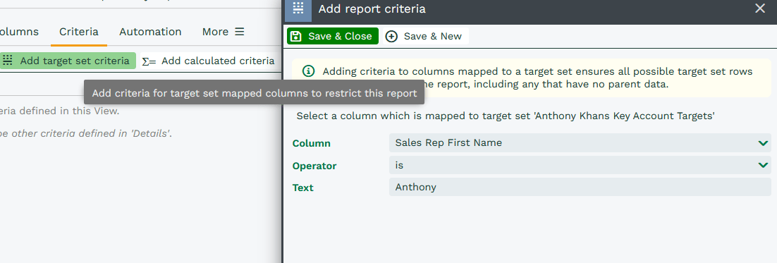 On a Summary view that contains a column using a Target Set, navigate to the Criteria tab and click the ‘Target Set Criteria’ button. Using only target set criteria will ensure that all target set records are shown in a report, including those without source details.