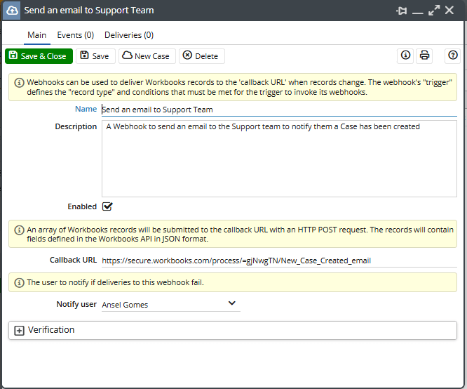 In this example it is referring to a web process located in the same Workbooks database that is designed to send an email to the Support team informing them that a new Case has been created. The complexity of the process triggered by the Callback URL is not limited allowing for an extensive range of automations to be achievable.