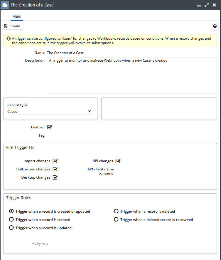 If you want to restrict the actions that fire the Trigger, for example only new Case records where the Priority is high, then you will need to contact the Support team after creating the Trigger. Workbooks will then update the Ruby Rule section to meet your needs where possible.