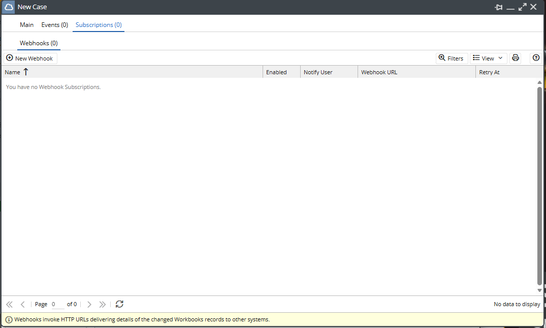 The Events tab logs every occurrence in which the Trigger was fired. The Subscriptions tab stores all of the Webhooks associated with the Trigger.