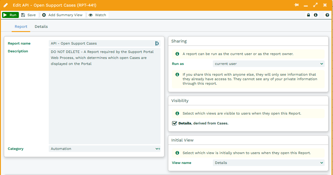 1.  Name the report appropriately, so that it is clear that it should not be edited or deleted, as this would affect the Portal.