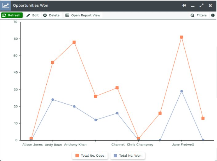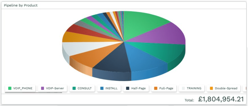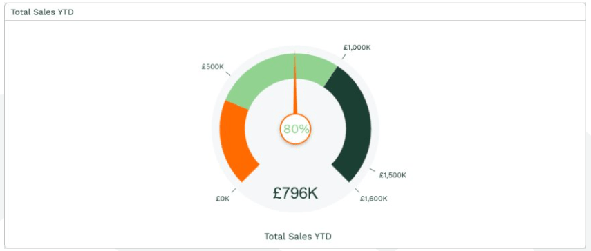 Dial Charts – Dial Charts let you see where you are against an overall target; these can be generated from a Summary View, such as the total value of won Opportunities against an annual Target.