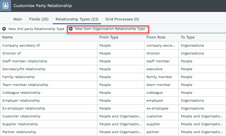 Workbooks allows you to create a relationship type between a Third Party and your Own Organisation. This is probably the most common type of relationship in Workbooks. To configure a Third Party to Own Organisation relationship, click Start > Configuration > Customisation > Record Types > Party Relationships > Relationship Types and then choose “New Own Organisation Relationship Type“: