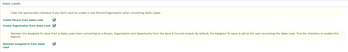 If you would not like the ‘Create a new Person‘ or ‘Create a new Organization‘ tick boxes to be automatically ticked each time you convert a lead, go to Start > Configuration > Database > Database Settings. Go to the ‘Sales Lead’ section at the bottom of the page and uncheck the appropriate tick boxes.