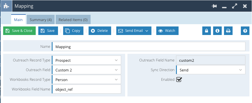 - Workbooks Record Type: This is a list of supported Workbooks record types that can be synced to Outreach and includes People, Organisations and Opportunities.