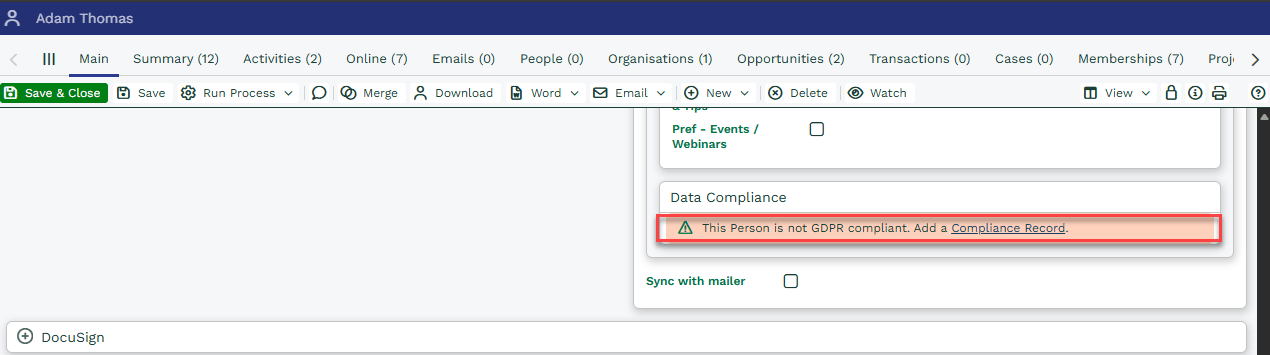 Compliance Records allow you to track the lawful grounds under which you process an individual’s personal data, helping you support GDPR and similar data‑protection obligations. Before creating any Compliance Records, ensure the Compliance Module is enabled in your Workbooks configuration.