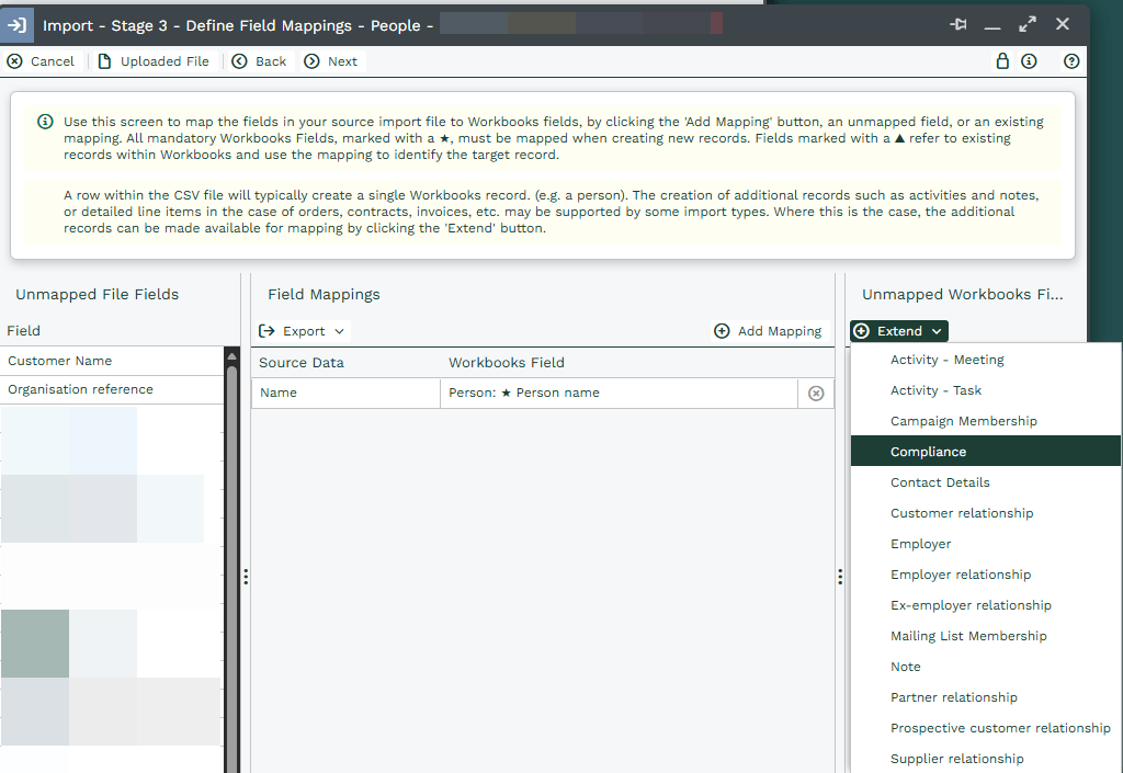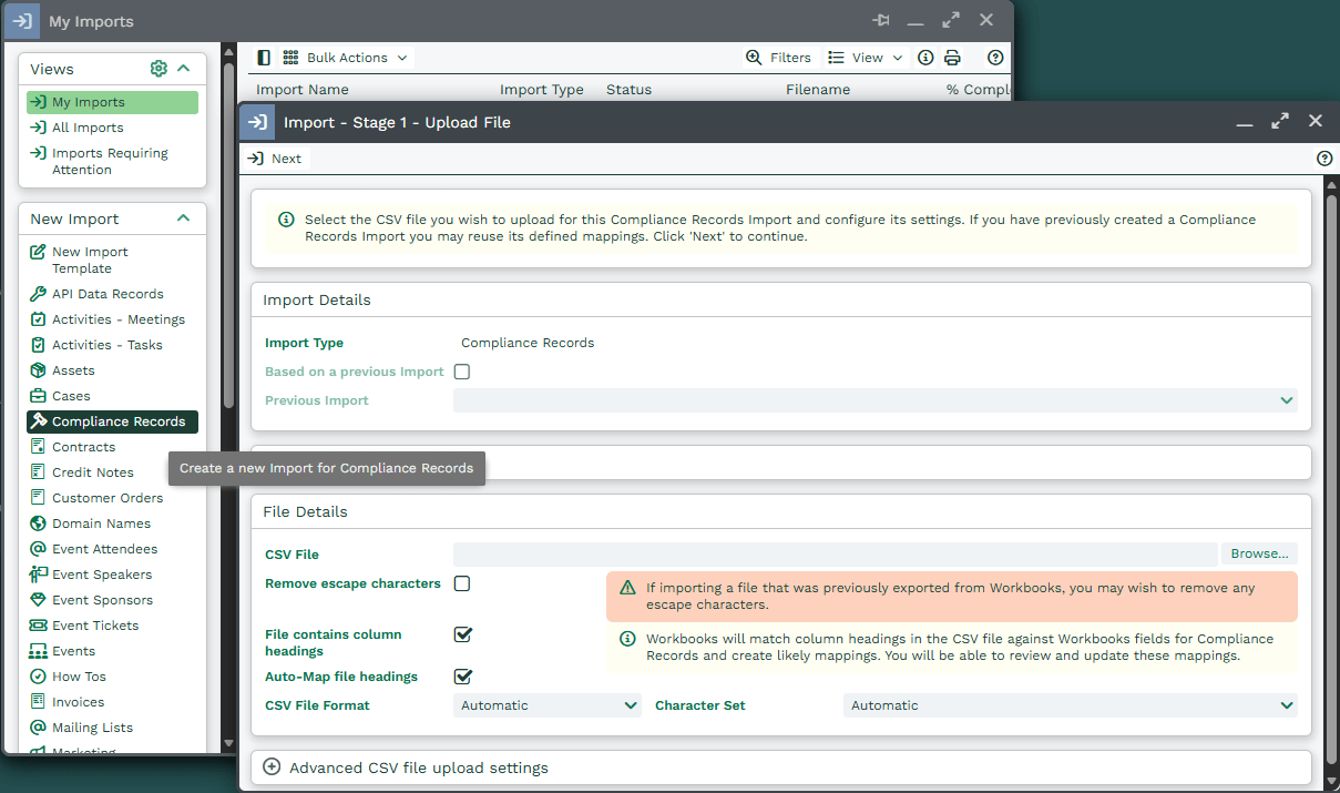 - Import: You can import Compliance records using the import tool. This can be done by either creating a Compliance Import, or by creating a Person or Lead Import and extending your import to Compliance Records. This is helpful when migrating data from legacy systems or consolidating datasets.
