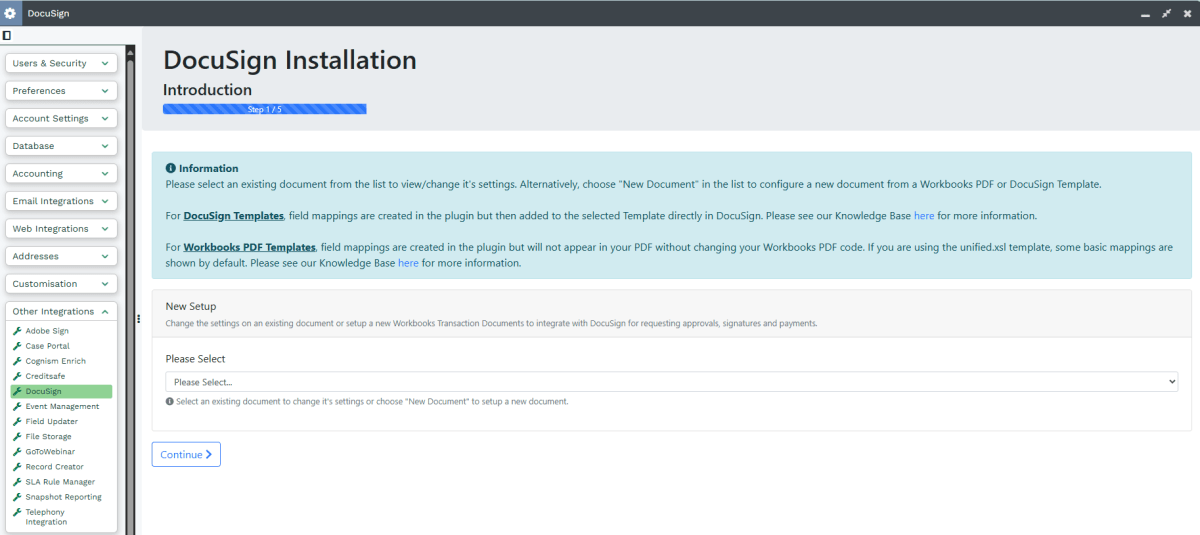 For Workbooks PDFs, you do not need to login to DocuSign to configure anything – all setup is completed within Workbooks. To access the integration configuration, click Start > Configuration > Other Integrations > DocuSign