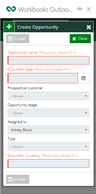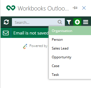 To create a new Record use the plus icon at the top of the Add-in, this will open a new picklist that will give you the selection of record types available.