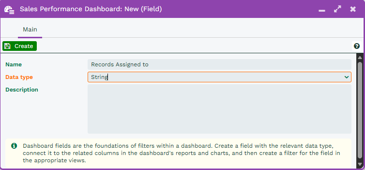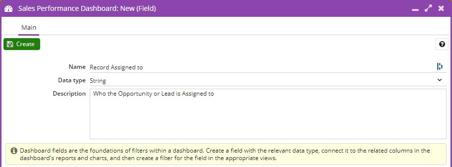 This Dashboard Field will be called âRecord Assigned toâ and will be using a Data type of String (because the Assigned to will always be in text form).