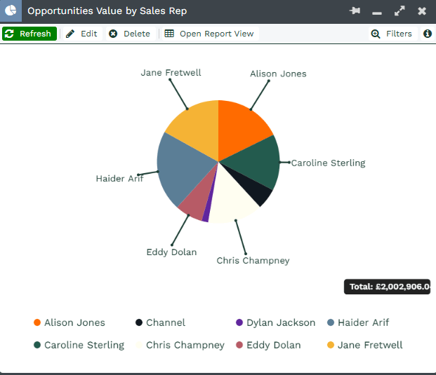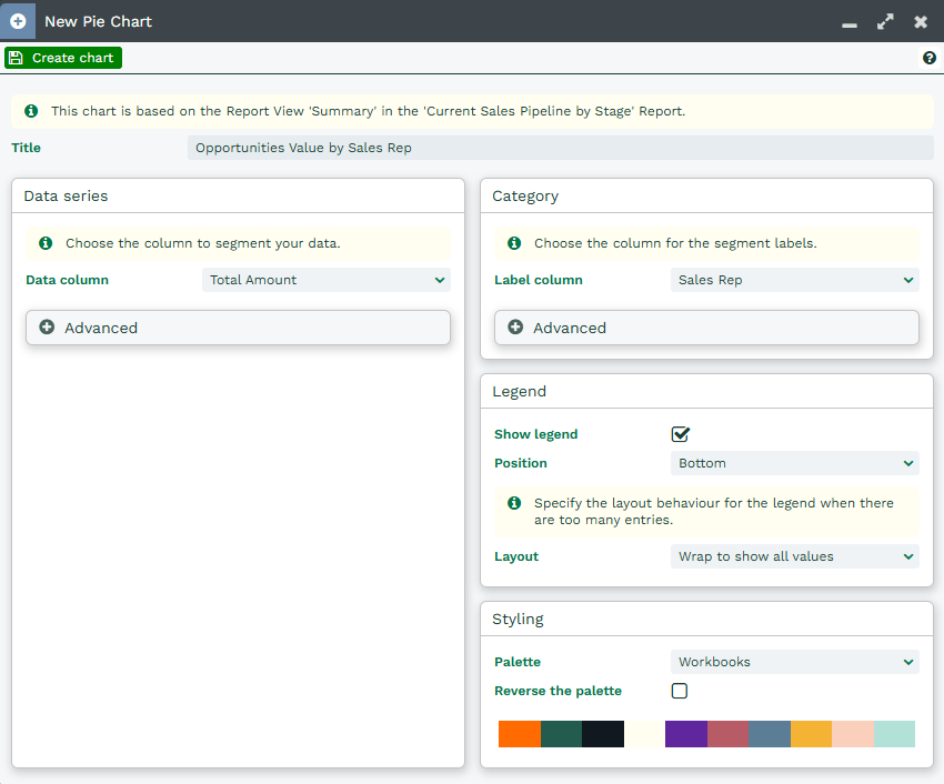 For this Dashboard we will create a Pie Chart for the Report Template â Current Sales Pipeline by Stage. To do this you will need to Run the Report and then select the Action Chart this view. We will then use the Total Amount as the Data Series and the Sales Rep as the Category.