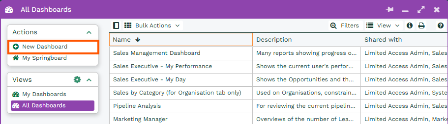 To create the Dashboard go to Start > Dashboards and then select New Dashboard.