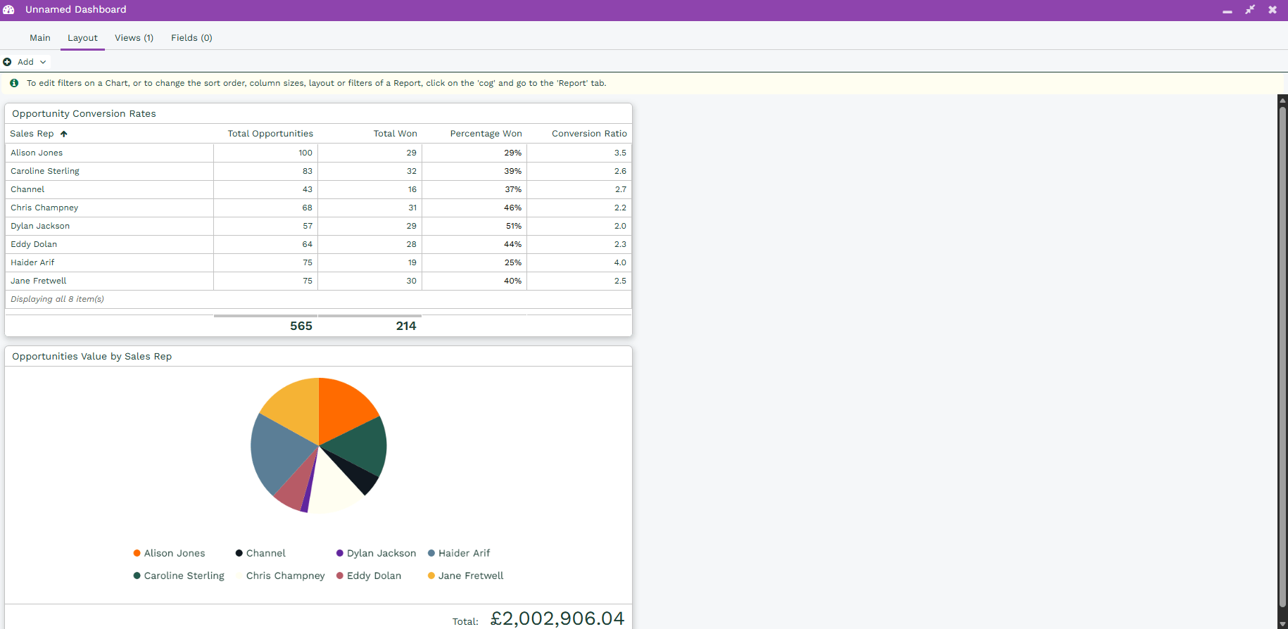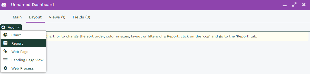 Click Save and navigate to the Layout Tab. Here you will be able to add the Reports and Charts created in Stage 1.
