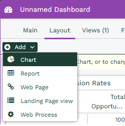 Once you have added the Report and Chart Views to the Dashboard all of the Views will appear in the left hand column with the most recently created will appear at the top.