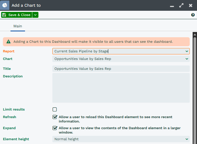 This time, only Reports with a Charted View will appear in the Report Field, which should make it easier to find the required Report. Similarly to a Report element addition settings can be configured for the Element, but we will use the default for this example.