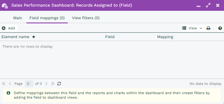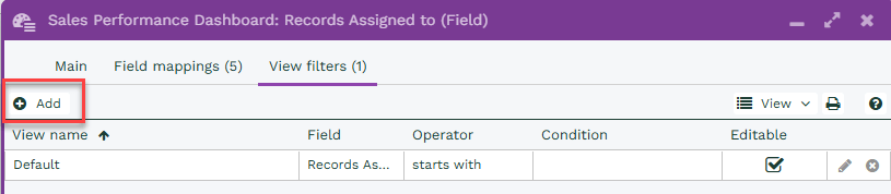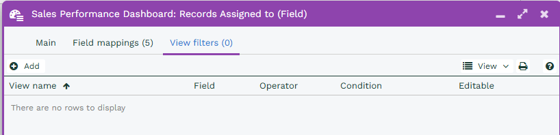 Once the Field Mappings have been set up we can apply filters to a Dashboard View. To do this go to the View filters tab and select Add.