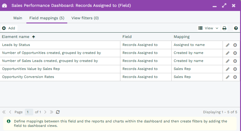This will need to be carried out for each Element within the Dashboard that you want to add the mapping to. Within the example below you should end up with a list of field mappings similar to the below.