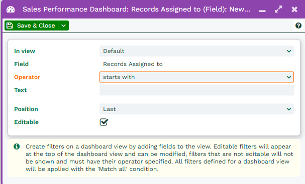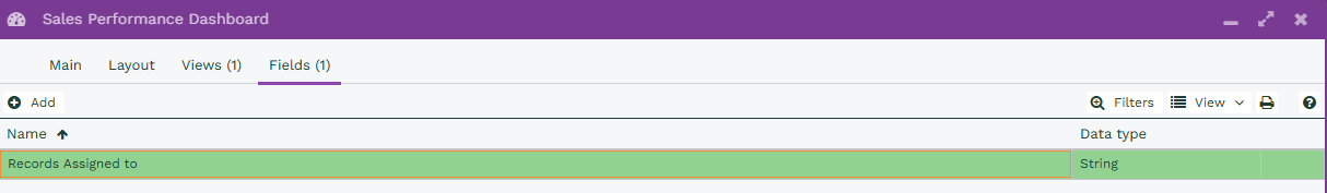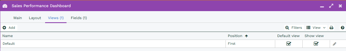 At the moment there is only one Dashboard View, Default. We will create a filter in the Default view that will allow us to perform a starts with search on the Record Assigned to Dashboard Field that has been created.