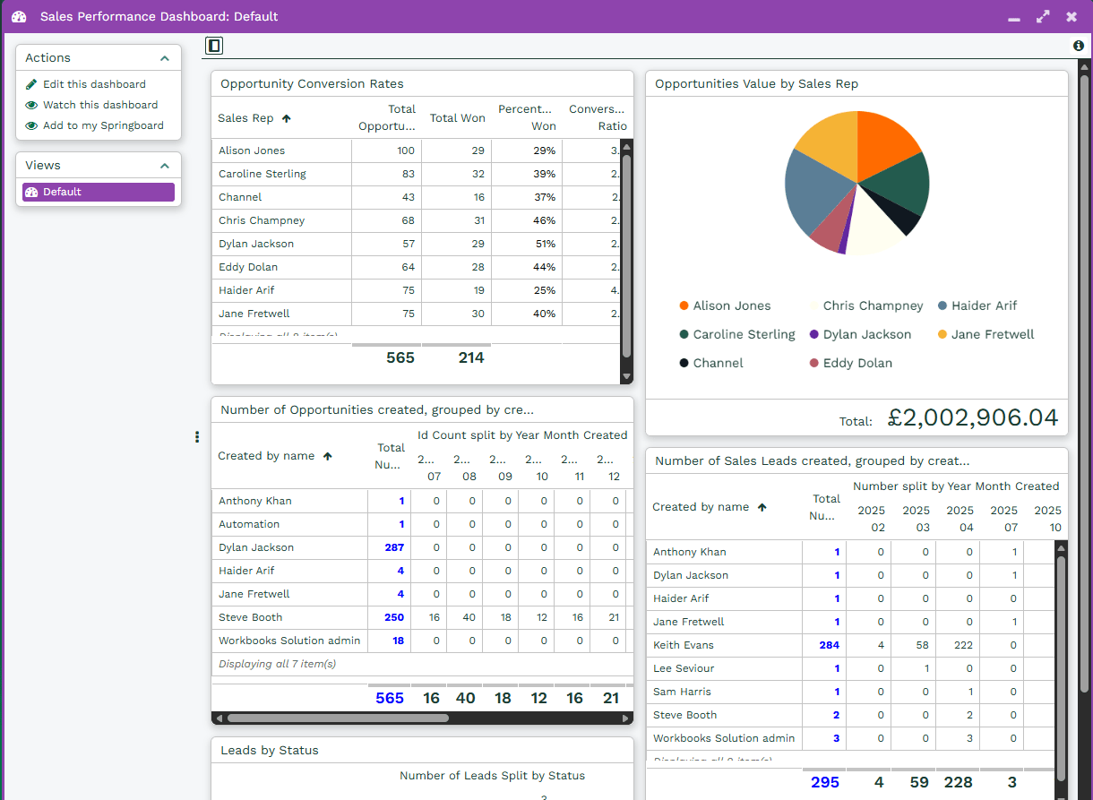We will now create a View to look at a specific Userâs performance across these Reports, we will then add an additional View filter to the Dashboard Field so that when the view is selected you will only see the specified Userâs activity.
