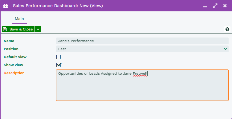 We will call this View âJaneâs Performanceâ and provide a Description to match this. Once this is done Save & Close this View.