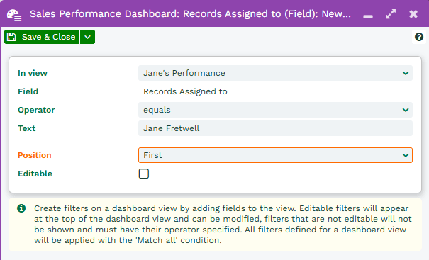 When setting up this Filter, we are going to select âJaneâs Performanceâ for the in view value, we then apply the operator of is and enter Janeâs full name. In this scenario we will also remove the editable setting from the filter so it will only ever output Janeâs details.