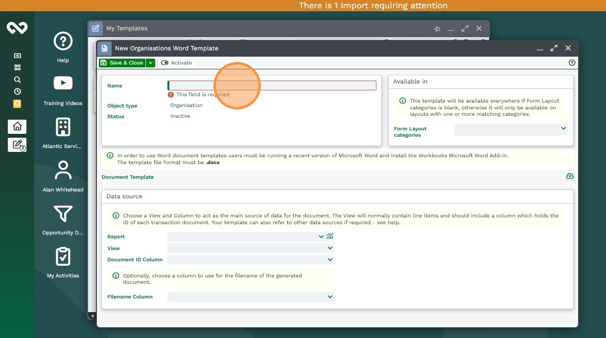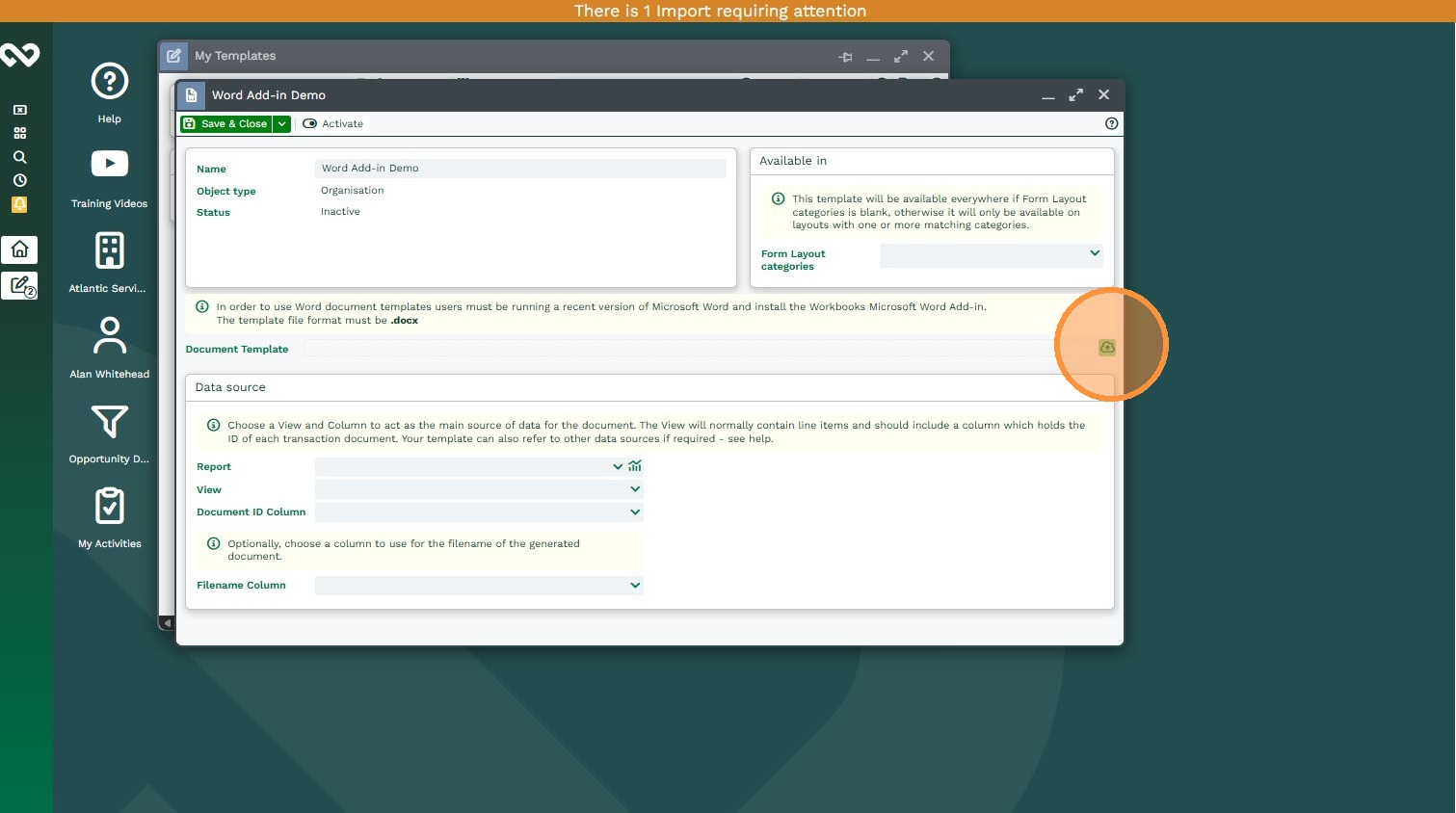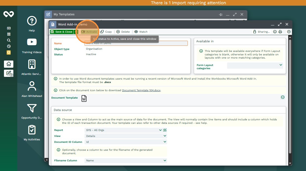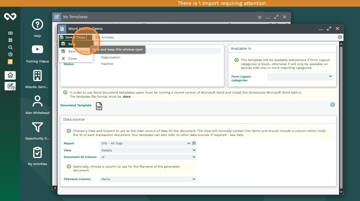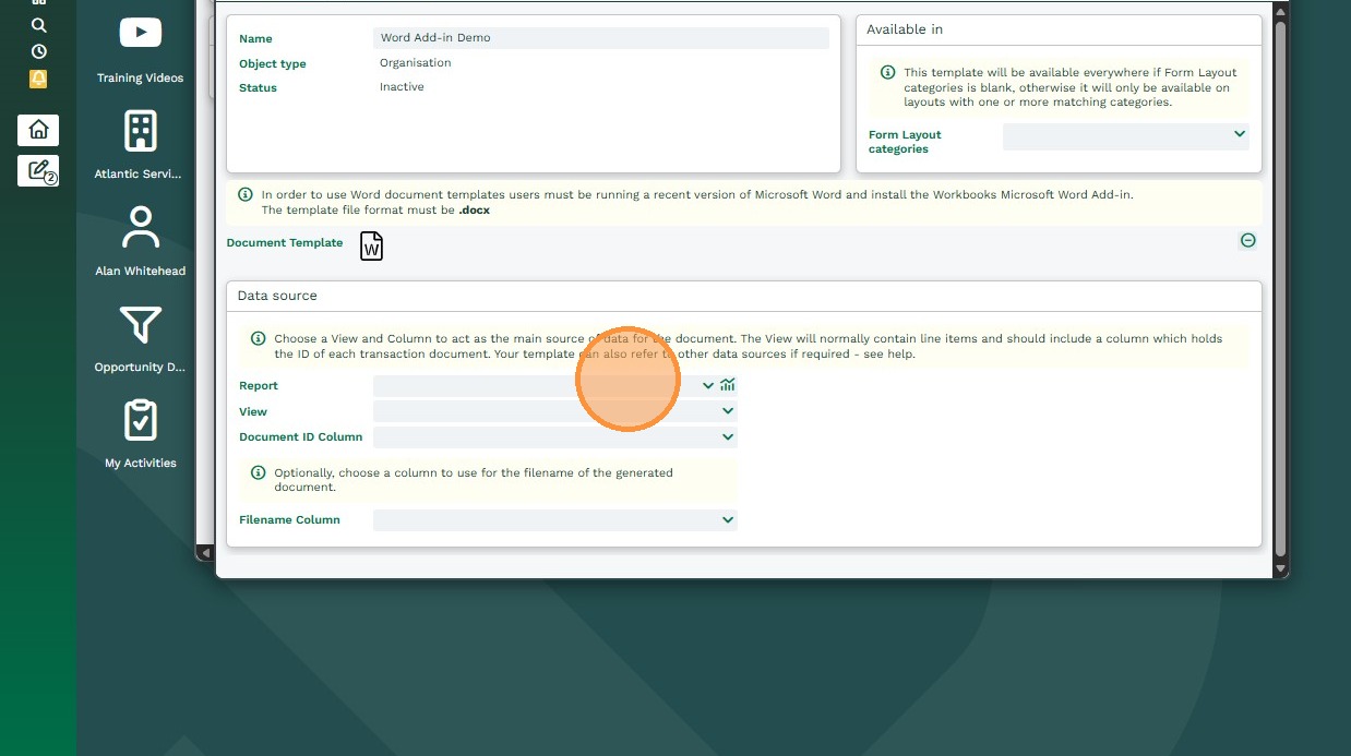 Once the Microsoft Word document and Workbooks Report are ready, you create a Workbooks Word Add‑in Template record in Workbooks to link them together.