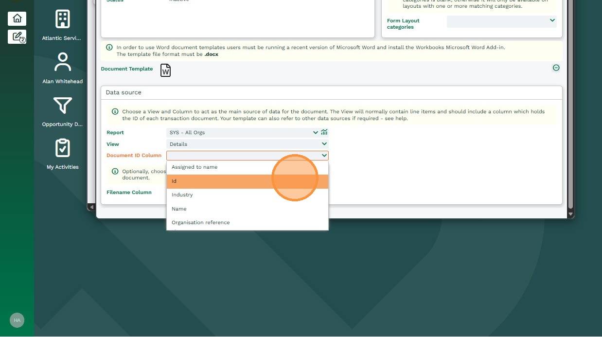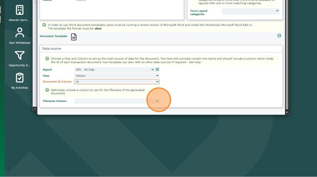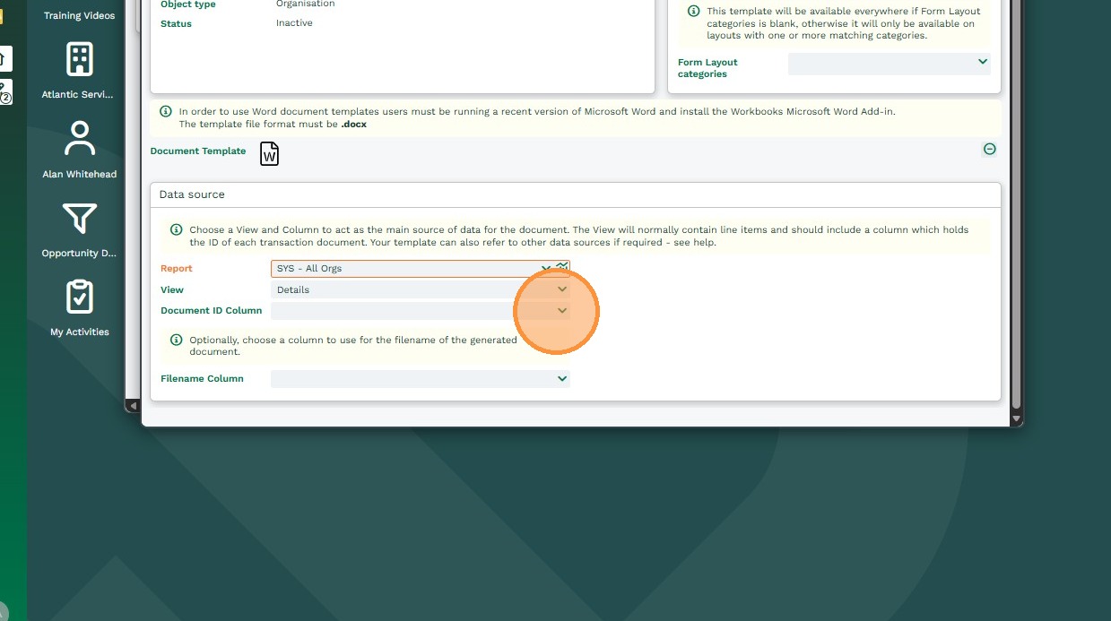 11. Filename Column: This will allow you to select a column in the Report that the add-in will use to name the document. In the example below, this column is an Organisation Name (as the Report is based on an Organisation) so the word document will be have the same title as the Organisation Name. If left blank, the Word Document generated will be titled with an Object Reference (eg.- ORG-117.)