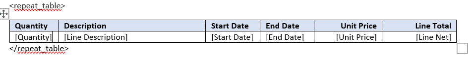 Therefore, the table in my Word Template will look like this: