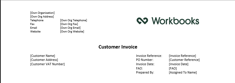 - Placeholders for dynamic data from Workbooks Report (for example: customer name, invoice date, totals). These should be the name of the field that you want to be mapped, between square brackets, like so