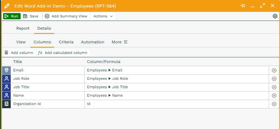 For example, I have a report called ‘Word Add-in Test – Employees’. I am using the ‘Details’ view and my template is on Organisation Records, so I am using the ‘Organisation Id’ as the id column.