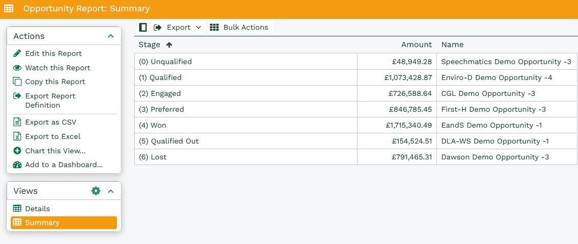 Below is an example of creating an Opportunity Report showing the total value of all open Opportunities on your database, summarised by the stage the Opportunity has reached. This an example of the sort of report we might be aiming for: