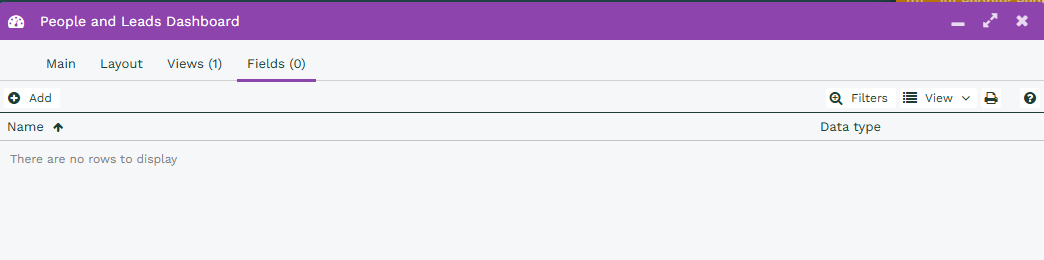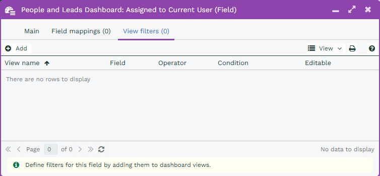 The final step is to apply this Field mapping to a Dashboard View (the same Dashboard Field can be applied to some or all of the Views as needed). From the View filters tab, you can review any existing Views that the Dashboard Field is applied to or select Add to set up the Dashboard Field on a new View.