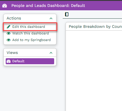 To add a filter to a report, navigate to Start > Dashboards and open your desired Dashboard. Then, select the option to Edit this dashboard.