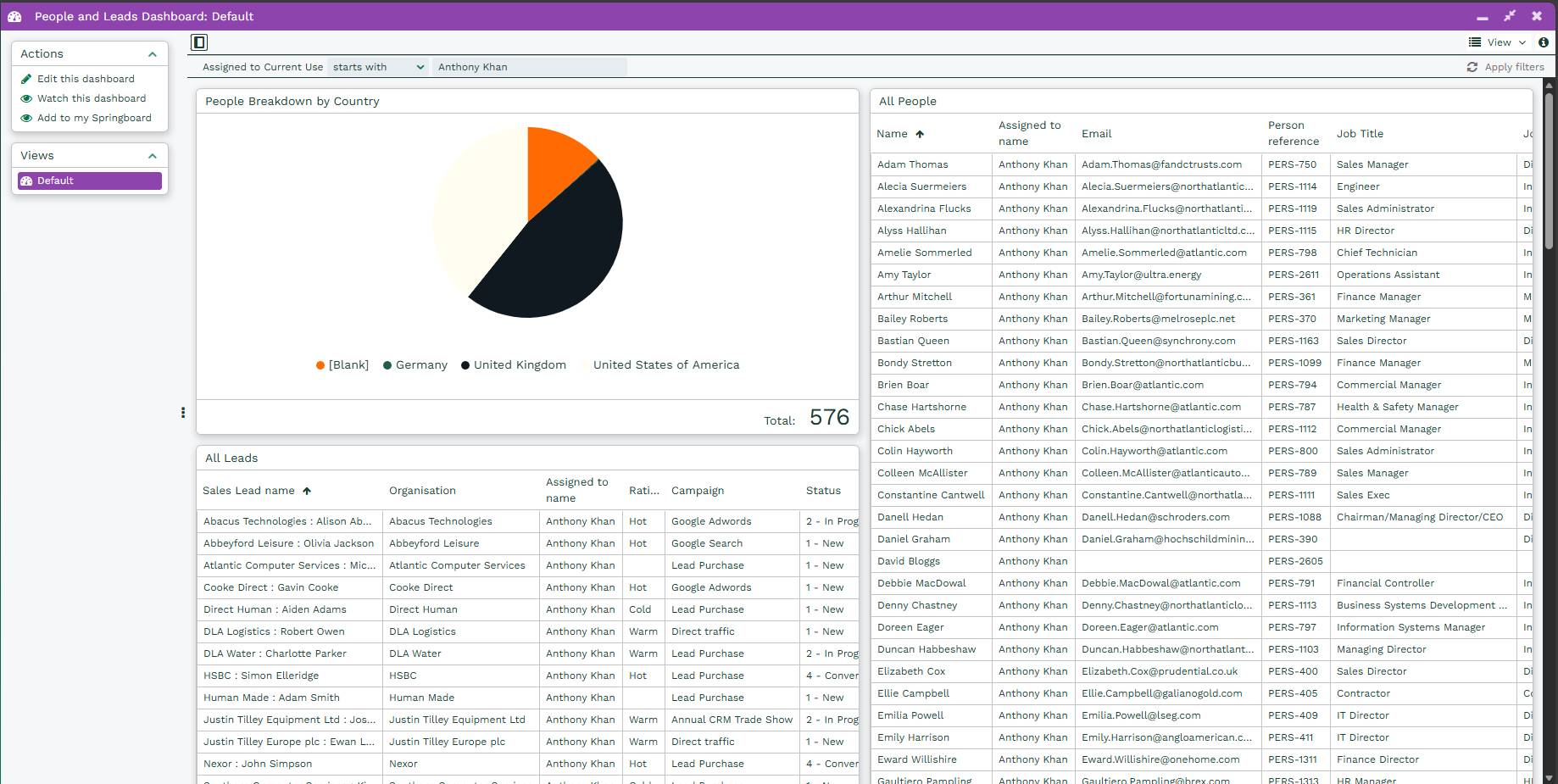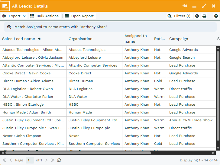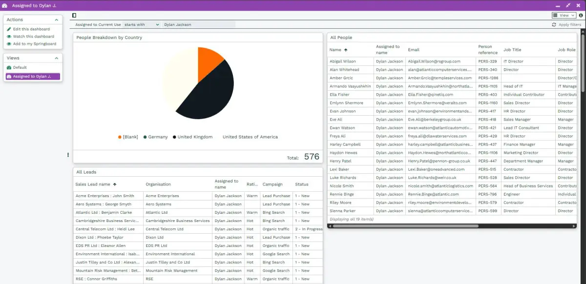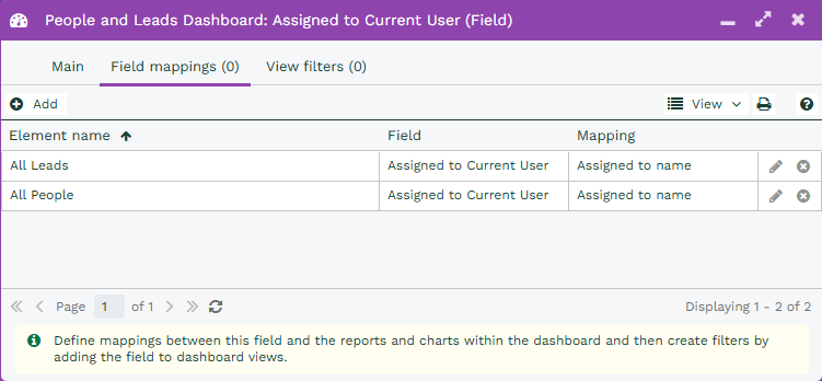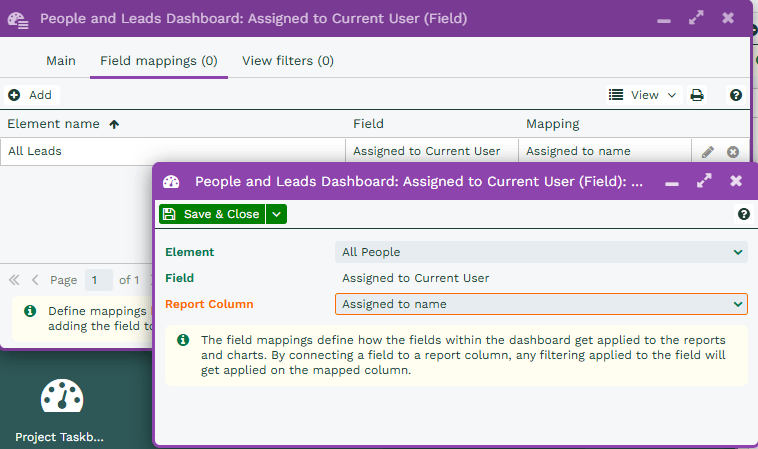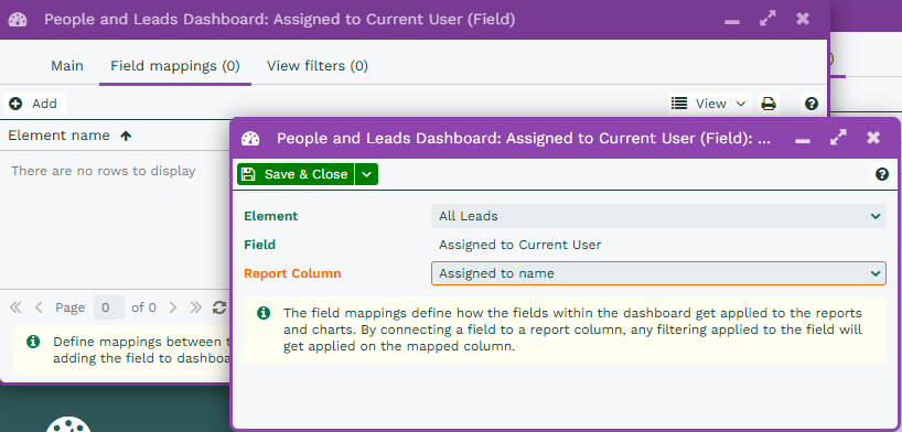 In the example below, the Element is the All Leads Report from the Dashboard, and we’ve selected the Assigned to name column from within that Report as the one that will have the filter applied to it through the Field Mapping.