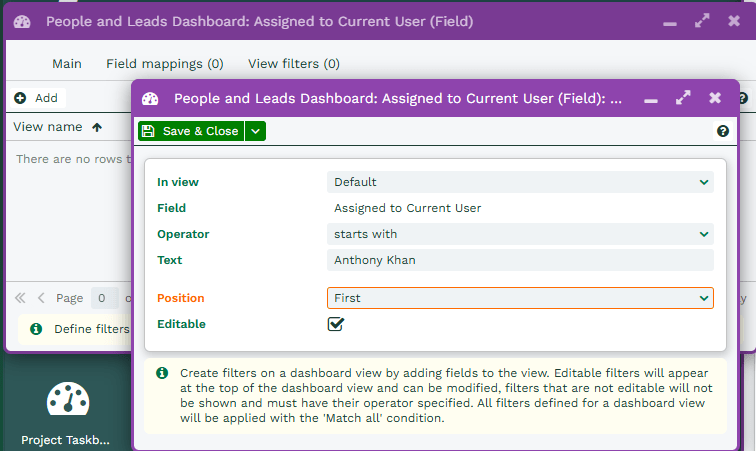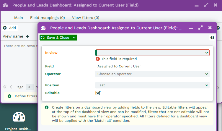 Once you click Add, you will be able to decide which Dashboard View the Dashboard Field will appear in. Like Field mappings, if there are multiple Views that you want to add the Dashboard Field to they will need to be each added separately. The Operator allows you to select the filter operator such as “Starts with” or “is in calendar range” and these Operators will vary depending on the Data type selected when setting up the Field initially.