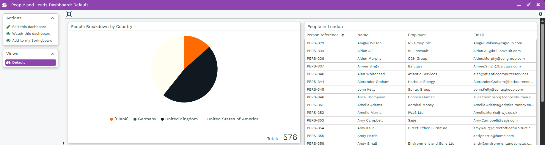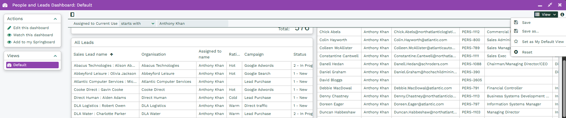 When a Dashboard Field is available on a View, the View button will appear like it would on a regular Landing Page, this has all of the same functionality as a Landing Page; allowing Users to create new Custom Views, name them and set them to the default view as needed.