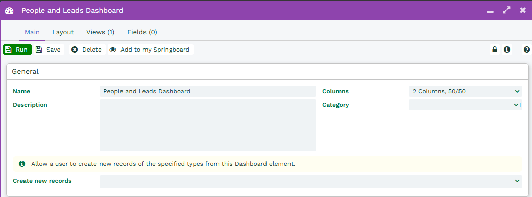 Once the Field has been set up as required return to the Main tab and Save or Run the Dashboard.